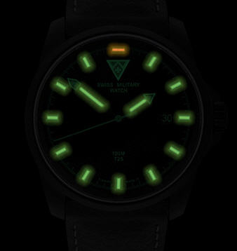 This is the Swiss Military Watch company’s “Millicurie ” pvd coated stainless model. Complete with my favourite H3 technology light source lume – which is simply unbeatable.