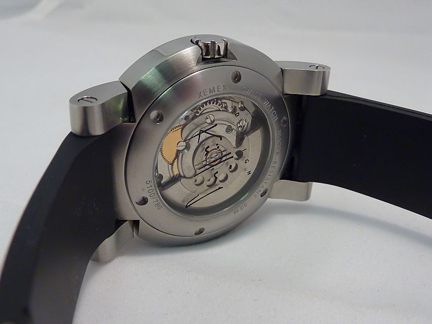 Note the well proven ETA 2836-2 Swiss movement which has a Xemex modified drilled rotor. Interestingly the watch is signed by the designer “inside” the exhibition glass back.