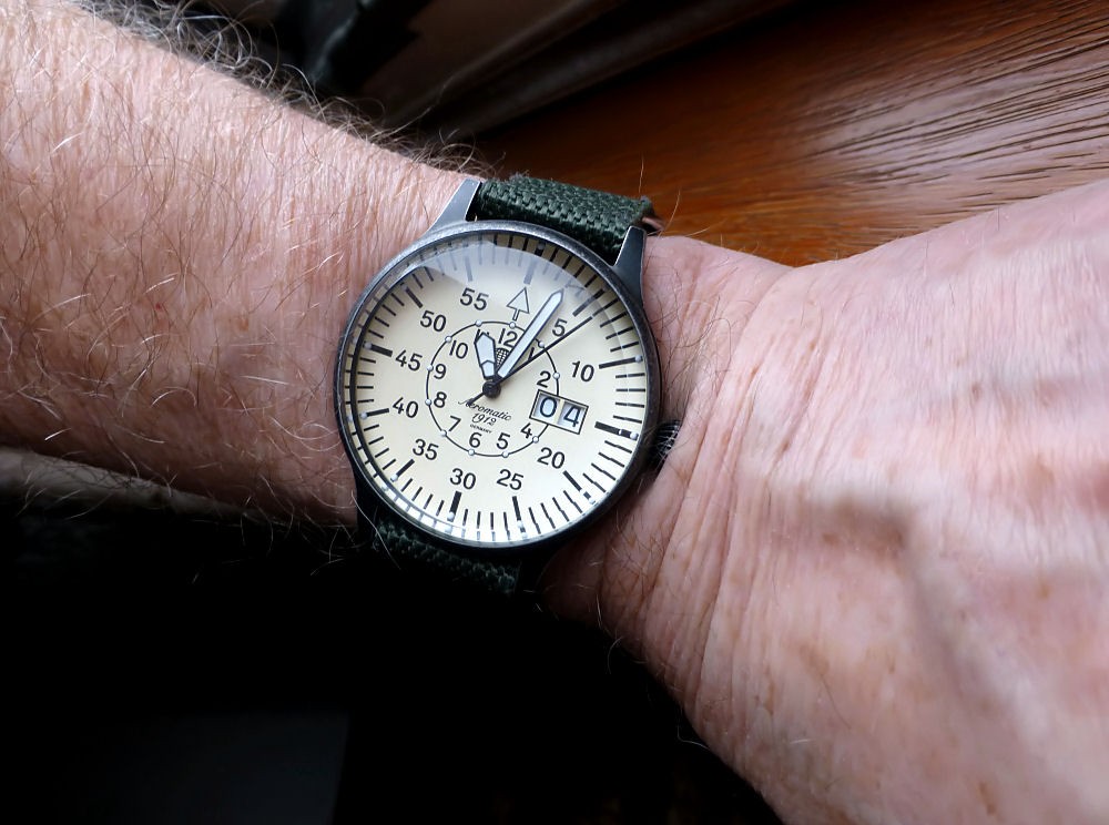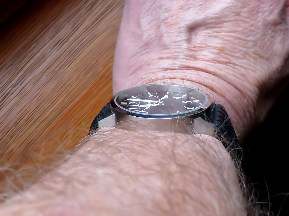 However the largest watches I own are (Fossil, Pulsar, Aeromatic, Casio) and all are oversize for me at roughly 53 or 54 mm or larger lug to lug. I can get away with 54 mm just, as it’s relatively thin and it sits low on my wrist and came with a very flexible soft silicon strap. Another when I first got it was hopeless, as the strap was really thick and stiff, which effectively made the watch even larger – I replaced it with a very soft flexible silicon one and it hugs the wrist so well now, it looks fine. The third one I again changed the strap to a Fast wrap – and what a difference that made (Aeromatic). Yes it’s big, but it looks OK (see image), so in these instances unencumbered by a large, heavy and stiff or molded straps – I got away with it. So a tip for those who end up with that larger than ideal model – check out alternative straps – they might solve your problem. I was defeated however with a Citizen Attesa. Lovely watch and one I always wanted but it was 56 mm lug to lug and not possible to change the strap/bracelet and it was just too darned big. I sold it on Ebay.