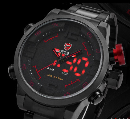 Another interpretation is a hidden on demand digital LED display on an otherwise analog dial watch – press the button (why are they always “detonator” red?) and hey presto, there’s a bright LED digital display – OK – actually I can go along with that one.