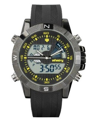 Take the INFANTRY Mens LCD Date Day Black Dial Combo Digital Quartz Watch for example. I mean it looks pretty good and has a fair bit of functionality with Day and Date, Alarm and Stopwatch displays. It cites multi-time zone, though doesn’t specify details). I do like the fact it doesn’t depend entirely on display,s as it features conventional analogue Hour, Minute and Seconds hands too. Another plus is that it takes a conventional fitting rubber strap (nothing molded here) and has a Japanese quartz movement. Mineral anti-scratch glass is quoted and there is also a dial light. Case dimensions are about normal for this type of watch at 47mm x 16mm, at 115gms weight, so quite large but without being totally silly.