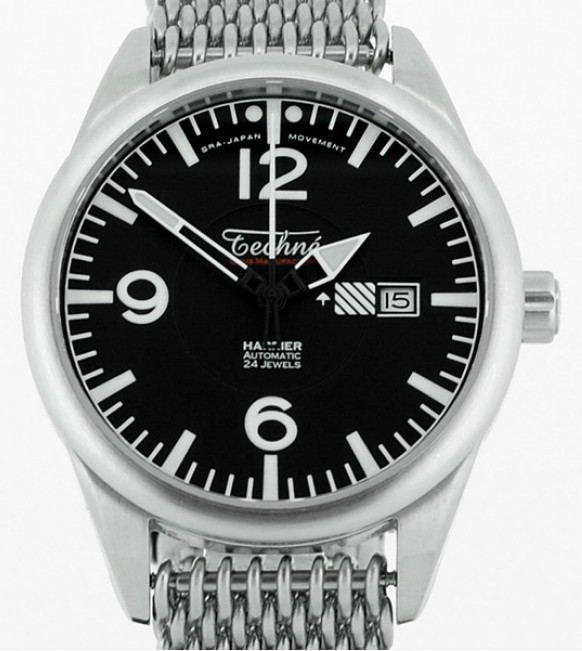 Because I like “aviator” style watches I thought I’d introduce this one Techné Instruments – the Harrier Automatic Cockpit Watch Model 363.090. One of the nicer Aviation style models around these day and in Automatic form represents extremely good value too. This particular version attracts me as it has a “Shark” super mesh link stainless steel deployment bracelet/strap, that lifts it from utility to officer class.
