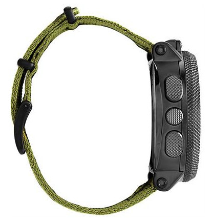 Also 48mm diameter (ex crown), made of 316L stainless steel with a K1 Scratch Resistance crystal. With the usual ABC features such as Altimeter, Barometric Pressure and a digital Compass, plus World Time and Alarms and so on it’s quite well specified. 10ATM Water Resistance so no worries getting it wet on your travels.