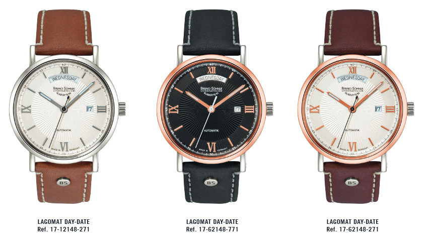 The above image shows a model from their range of mechanical automatics, the Lagomat Day-Date model in three versions and once again shows off the design elements that Bruno Söhnle are so good at – elegance and readability without clutter. Note the Day is indicated in full @12 in addition to the Date and very reminiscent of the Rolex Day-Date, was first produced in 1956 and good ideas are well worth repeating.
