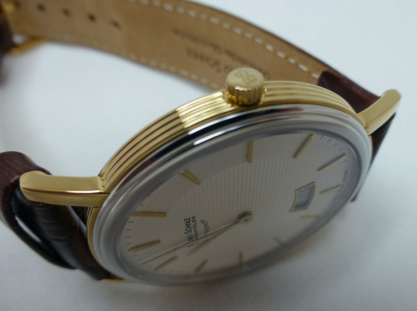 Another Quartz Bruno I’ve noted is the excellent Pesaro 111 model 17-13073-121 which again has a modified Swiss Quartz Ronda 7004 movement, with Day and Date. Yet another model I find I like. There are a few versions of this, starting with the Pesaro 1, then 11 and now 111, each emphasizing different aspects of the dial. However for me the latest Pesaro 111 is the one I prefer, basically owing to the elegantly contoured black hour and minute hands (reminiscent of the older Calatravas) that give excellent contrast against the beige dial and it’s particular configuration. The Pesaro 11 for example has infill hands which although still elegant and I understand luminous, for a dress watch I find the high contrast black steel is my choice.