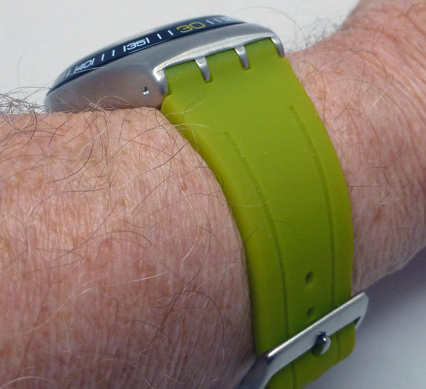 It is also quite comfortable to wear with that soft rubber compound strap, though for me it has a sort of “think” feel to it. Note the double buckle arrangement, means you can use it two different ways, either under the metal or over (shown here as under) it is actually more comfortable with the strap over the buckle and using the single keeper only. However, I would prefer a simple buckle – period. As to the straps longevity – we’ll just have to see how it goes but first impressions are OK!