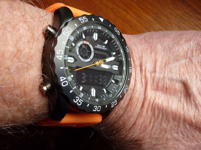 On the dial, which is nicely arranged, there is a lower digital window showing the Time, Day and Month (selectable). Using the pushers you can also dial up Stopwatch and Alarm. The Day of the week is shown all the time on the small sub dial between 10 & 11 using digital segmented markers, with Sunday in red at the top, going round to Saturday at about 11 on the small dial.
