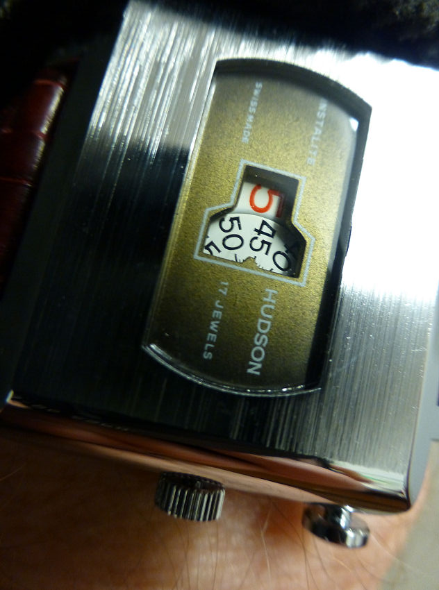 Some were true “Jump” designs where the Hour digit only moved or “jumped” forward at the last second of the Minute Counter digit. Others sort of gradually slid into position as the changing of the Hour approached, though these often caused a little confusion when not fully changed, being sort of stuck in no-man’s land between hours. This model falls into this category – at the hour and 55 seconds, it’s sometimes tricky to tell which hour it actually is!