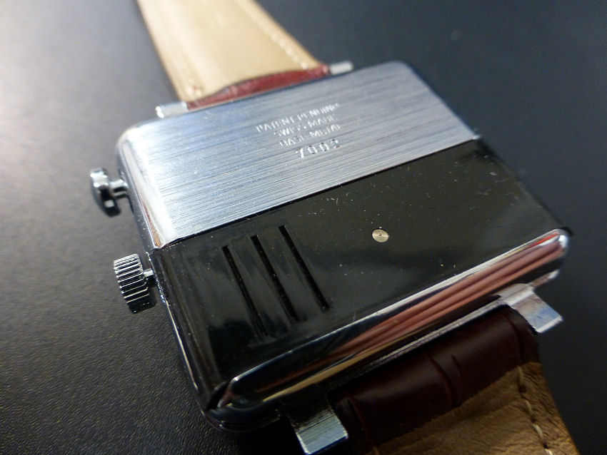 The term “Instalite” is in reference to the battery powered dial light which illuminates the dial digits rather well in this case and operated via the push button @1 above the central crown. The battery is easily accessible via the dark colored plastic sliding rear cover, which is separate from the movement, which itself can be seen only with the entire 2 piece metal “snap” back removed.