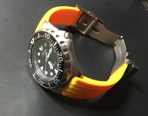 I found another “diver” style watch, an old favourite at the time – the very neat Citizen BN0000.04 Eco-Drive Promaster 300m Divers’ Watch, which I have owned for more years than I care to mention. It differs from the Apeks, as it’s Eco-Drive, 300m Water Resistance, but it’s not in the same league for clarity – in that the solar sensor face is glossy, the hands and markers slightly too close for quick glance reading, especially at night (even though luminosity is good). The Date window is a little small, the bezel ( an aluminium insert) is not as knurled as I would like and slopes away from the dial, so is not that easy to use (possibly gloves may give a better grip).