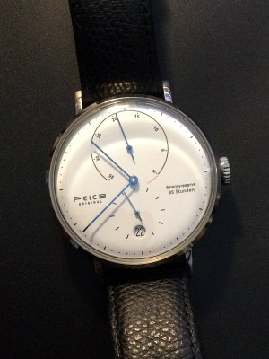 The Feice FM202 Automatic is another model from my affordable mechanical automatics, which has an interesting look. Simple white face on which rotates blue hands. Hours, minutes and seconds, Plus a Power Reserve indicator, so you know, how long it has to run – without either simply keeping it on your wrist, or winding it – your choice.