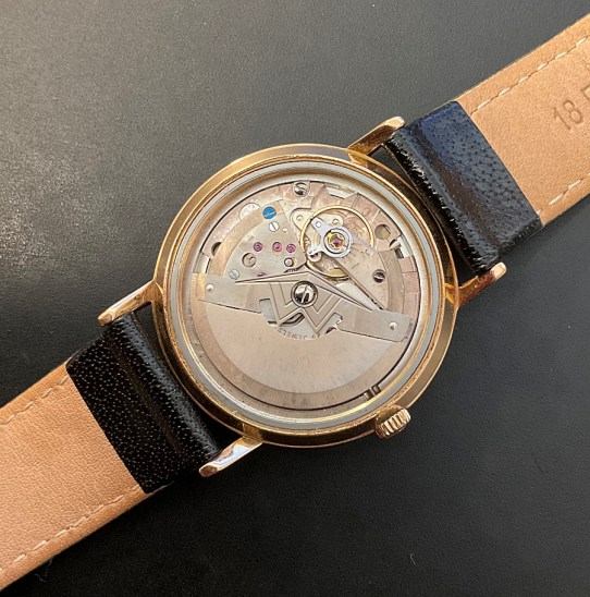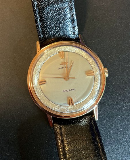 Without doubt one of the nicest dial gents Movado I’ve yet seen, this was a must purchase. 1960’s vintage with a Movado Cal 395 – C, Automatic movement. This is their famous Kingmatic Sub Sea model with 28 jewels and running as sweet as it did when new (as of today 17/03/24) this sort of mechanical marvel never fails to impress me. Over 50 years (60 now) and still perfect it has a neat 34mm diameter gold micron plated case, centre sweep seconds and applied gold markers on 3, 6, 9 and 12.