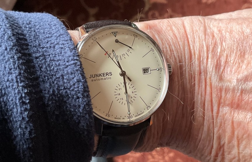 The watch appears to have a close resemblance to the Max Bill series that I also like in that it shares the elegant yet simple dial layout which is uncluttered and practical. The 20 mm strap is slightly thinner than my previous Junkers and is of amazingly good quality, being of a high quality soft leather. Regarding the holes available and my smallish 165 mm wrist, it’s a neat fit on my smallish 165mm diameter wrist.