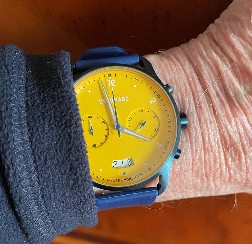 Every so often I have a look at what’s on offer around the watch world. And this time I was having a look at affordable chronographs, preferably mechanical, but came across the rather outstanding looking Quartz powered Detomaso Sorpasso. I was quite intrigued in particular by the Diallo Blu model, at first on it’s looks alone and was curious to see if this particular dial colour combination of yellow and white? actually worked out. And of course how did it’s chrono function stack up.