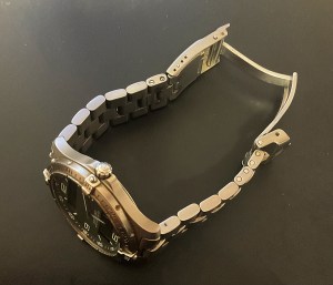 The most common version is the fold-over clasp type, with a metal link bracelet (made up of metal links) attached at the watch via the spring bars and some may have an intermediate curved plate, between watch case and spring bar – to match the curve of a round watch for example – and makes it more integrated. These bracelets are usually adjustable for wrist size by removable pins on the bracelet and often a small adjustment on the clasp too.