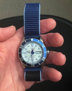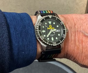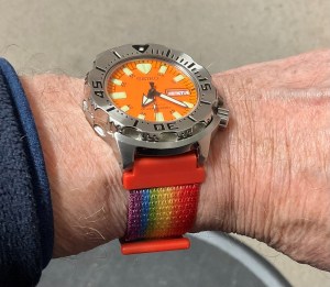Note – I hasten to add that this particular wrap-strap style can look good on many watch models, but there are other considerations of course. I wouldn’t want it if I was actually diving – I’d likely stick to the original one that came with the watch. But just for a change of look, it’s basically a bit of fun and at little cost. It can brighten up your Day. And if you’re into “smart” stuff, I have seen them on the odd Apple watch (whatever that is?) and it looks good too).