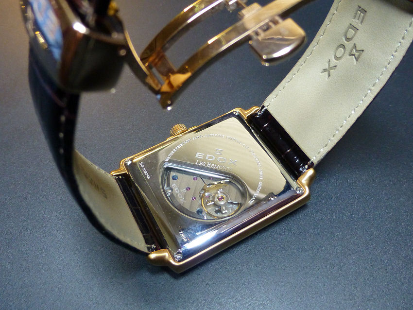 The case is stainless steel, gold plated with an exhibition back with part cutout to view the 7001 movement. The watch is Water Resistant to 5Bar. The 22 mm lug measured strap is high quality leather fitted to an Edox deployment (with extensions) mechanism, which is one of the most comfortable I’ve worn as it lies very flat on the wrist.