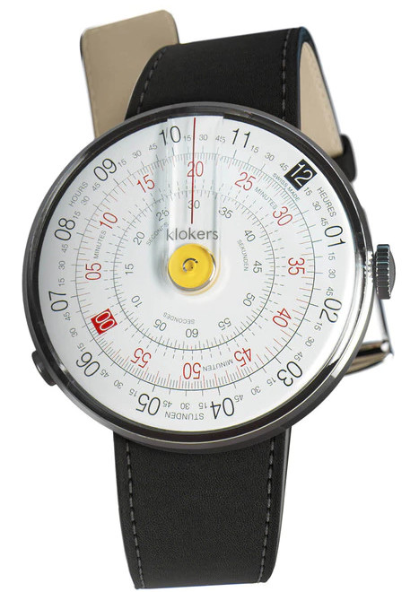 This is the Klokers Klok 01-D1 Yellow Matte Black Leather – which is an update of the old disc watch, where Hour, Minute and Seconds discs move round a large dial and pass underneath a vertical fixed pointer which highlights the time.