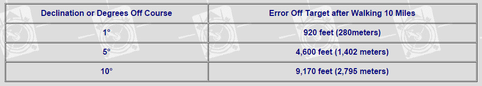 However if in a part of the world where the declination is large then it is sensible to adjust for it – the table shows the your track deviation after 10 miles with different degrees of declination.