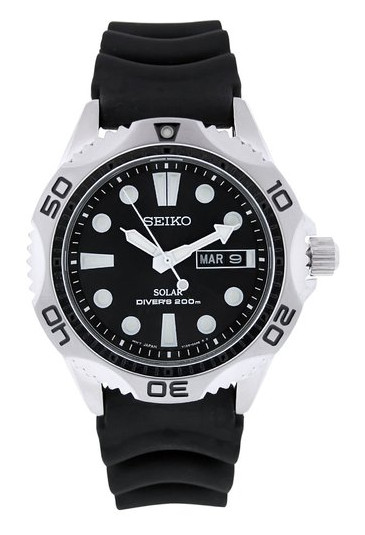 Actually a choice of 3 model versions here – basically it the Seiko Solar Quartz Scuba Diver Sports SNE107P2 black dial or the same priced Seiko Solar SNE109 with a pale Orange dial or perhaps the slightly more expensive (discounted) Solar SNE245P9, the latter probably being my choice if looking for a Solar Diver.