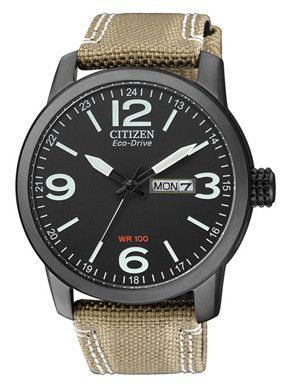 Some versions have a bracelet, others straps and one I saw at some time ago at Timeshop4you – the BM8476-23EE has a textile strap, black coated stainless case and a cleaned up grey tone dial which makes it look very modern military. Slightly larger at 45mm inc crown x 11mm depth probably as a result of fashion change for larger watches.