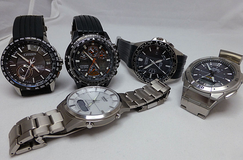 A small collection of Solar and Radio Control models all featuring similar functions with the exception of the far left Citizen Satellite model. Whilst it receives a Radio signal too, it’s from a satellite orbiting the Earth and not a ground based transmitter. I just love a Radio group photo as they all show the exact same time!