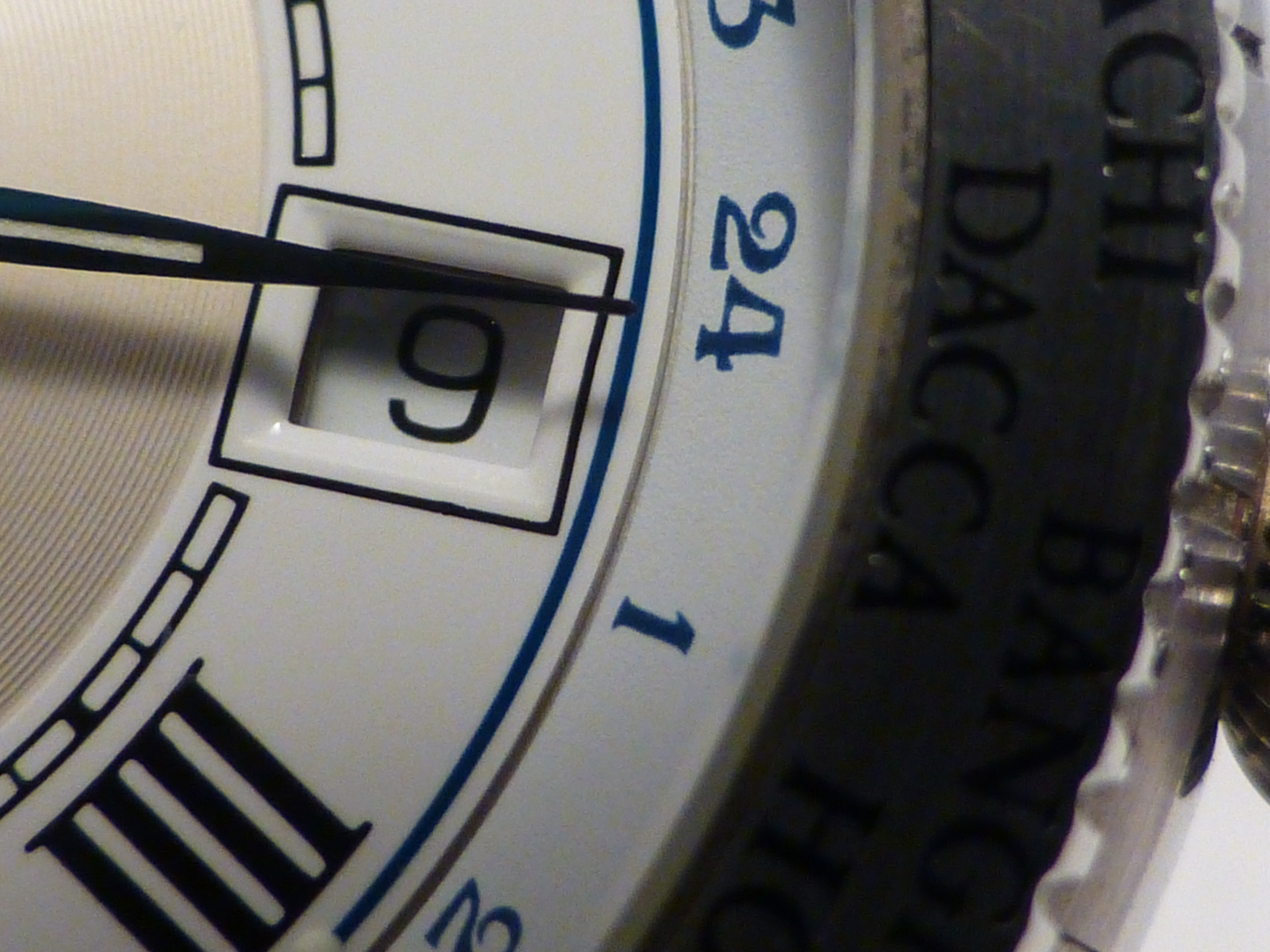 The black numerals and blue GMT indexes are also perfectly and evenly applied and the very fine GMT chapter disc moves silently with the main hands indicating 24-hour time. Using this in conjunction with the single click hour hand adjust, it’s simple to set your local time to the city required on the outer bezel. Interestingly using when adjusting the time, the hands can be moved either way, hours, minutes, date and 24hr GMT indications can move forward or back. If going back a day, the date simply clicks back one day. This is something I’ve personally not noticed on a mechanical movement before and is very useful.