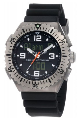 The Format 4 actually has an impressive function set – both analogue and Digital displays. Analogue Hours, Minutes and Second hands and Digital two Digital displays which can show a whole range of indications – such as – World time (59 cities plus user defined), 5 Alarms plus a schedule Alarm, Date, Day, Month, a Chronograph and Stopwatch 23, 59,59 with multi-laps, Timers. In addition the digital displays can be switched OFF facilitating power savings with or without auto on feature and the watch has Super-luminova analogue hands and indices, plus a 3 second duration EL back light, so no problems in the dark, even if not using the digital features. The watch has a Mineral anti-glare crystal, uni-rotating bezel (useful), a 200m Water Resistance (20ATM), with large screw down crown and back and takes a standard 22mm strap or bracelet and is powered by a Swiss quartz movement. And the 2 year Guarantee is extendable to 6 years.